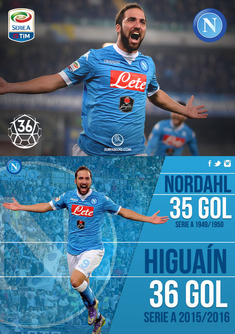 Con 36 reti, il bomber del Napoli ha superato il primato di Gunnar Nordahl di 35 goal nel lontano 1949/50. Negli ultimi 65 anni solo Angelillo e Toni erano riusciti a superare quota 30 reti in campionato. Il Pipita ha commentato così “E’ una gioia immensa poter superare questo record. Ci tengo a ringraziare la mia famiglia, tutto il Napoli, la squadra e lo staff tecnico. Mi sento molto orgoglioso perché tutti mi hanno aiutato a fare questo. Sapevo che potevo riuscirci ma dovevo stare calmo. Al primo tempo non ci sono riuscito, ma poi ce l’ho fatta!”