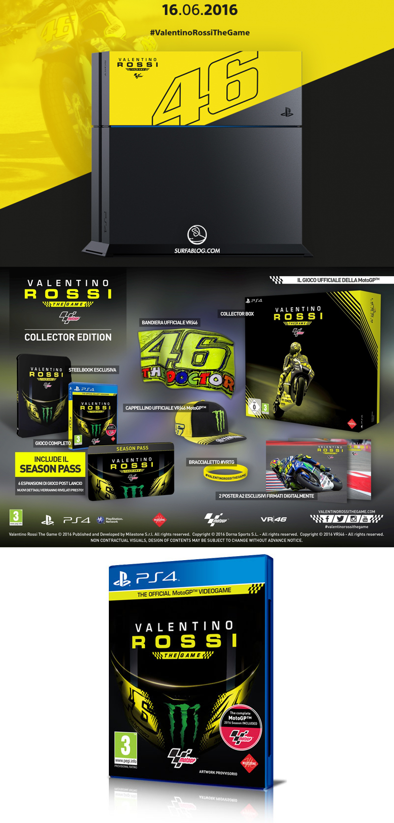 Per l’occasione Sony ha realizzato un bundle con una console in edizione speciale, la prima che è possibile acquistare solo in Italia. Il videogame permetterà al giocatore di trovarsi alla guida di moto da sogno su 18 tracciati ufficiali della stagione 2016 e 5 circuiti storici. Si prende parte, al fianco di Valentino, a gare di drifting, flat, R1M o rally per vivere il sogno di entrare nella VR46 Academy e raggiungere la MotoGP.