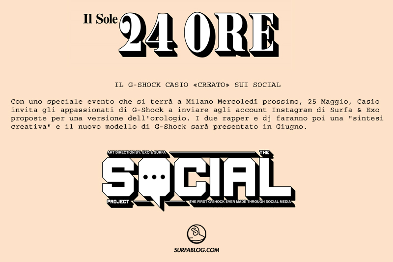Nell’articolo è scritto “Con uno speciale evento che si terrà a Milano Mercoledì prossimo, 25 Maggio, Casio invita gli appassionati di G-Shock a inviare agli account Instagram di Surfa & Exo proposte per una versione dell’orologio. I due rapper e dj faranno poi una “sintesi creative” e il nuovo modello di G-Shock sarà presentato a Giugno”.