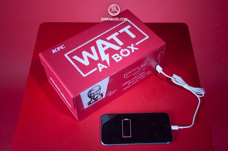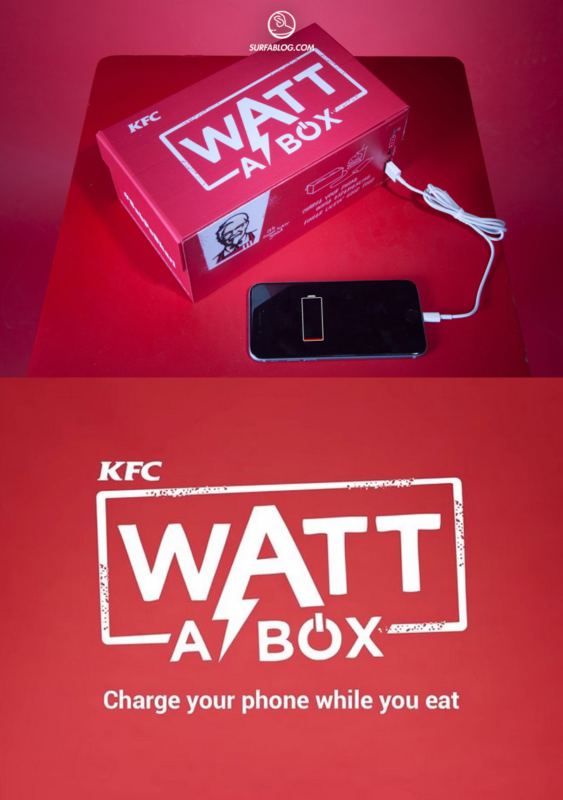 KFC ha realizzato “Watt a Box”, una scatola che ricarica lo smartphone. Il nome è un gioco di parole, infatti significa sia “Che scatola”, sia “Scatola con i Watt”.
