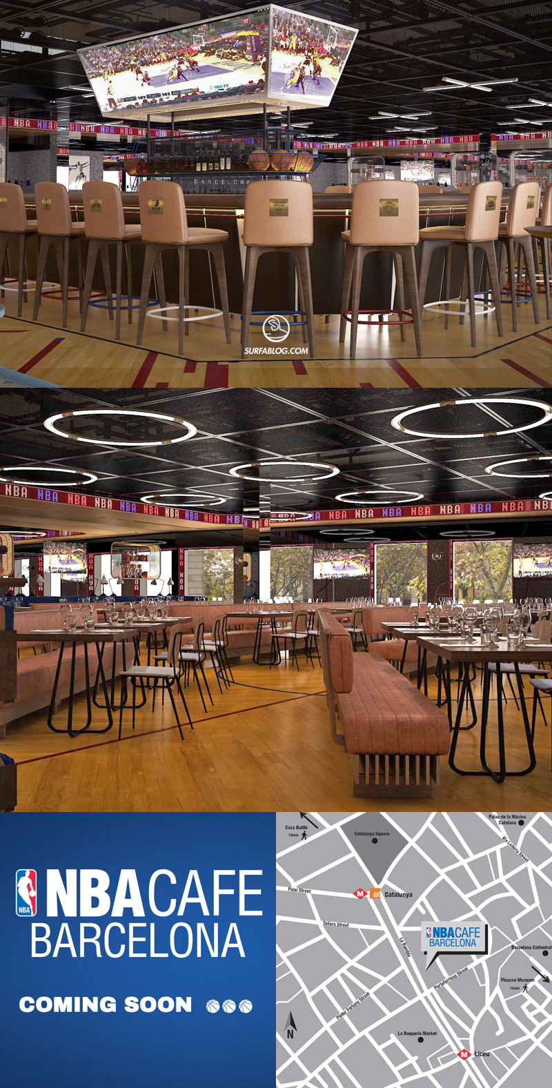 L’NBA Cafè di Barcellona, il primo locale nel suo genere aperto in Europa, offrirà ai visitatori un’esperienza culinaria e d’intrattenimento unica, catturando l’energia e le indescrivibili emozioni tipiche del mondo NBA all’interno di un locale all’avanguardia. Il locale sarà progettato da Lazaro Rosa-Violan, famoso interior designer spagnolo, i cui lavori si possono apprezzare in più di 230 hotel, ristoranti e punti vendita al dettaglio in tutto il mondo. Il Cafè sarà pronto per l’NBA European Game 2016, che si svolgerà appunto a Barcellona e a Madrid.