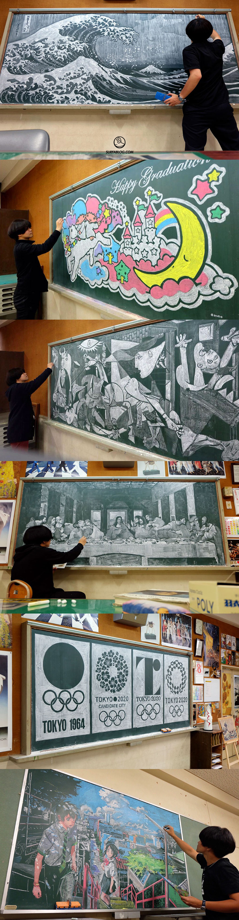 Hirotaka ha infatti dato vita ad una serie di opere realizzate con il gesso sulle lavagne delle sue aule. La sua arte viene chiamata “Chalk Art”, e spesso riproduce alcuni quadri di pittori celebri e storici. Wow!
