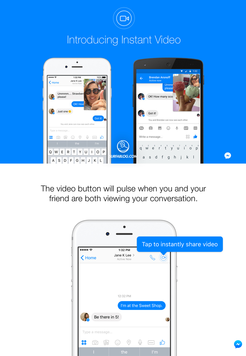 All’interno di essa infatti comparirà in alto a destra un’icona a forma di videocamera che permette di avviare il live tra i partecipanti alla conversazione. Dopo “Stories” su Instagram, anche questa novità di Zuckerberg sembra essere presa da Snapchat. La nuova funzione è stata presentata in questo modo “La videochiamata è un prodotto ancora relativamente nuovo, e fino a poco tempo fa riservato solo alle occasioni speciali. Instant Video è solo il rifletto dell’ubiquità del video. Dovevamo attendere semplicemente di avere la capacità di usufruirne in tempo reale e per tutto il tempo”.