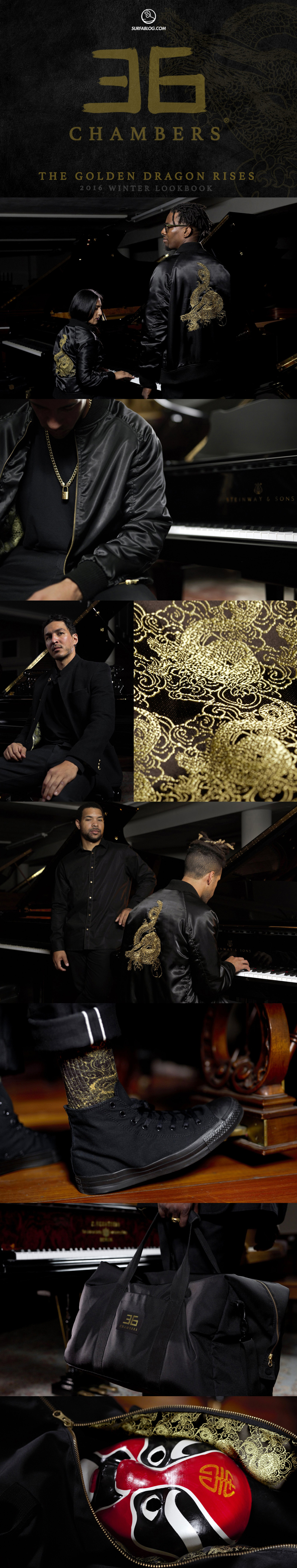 La collezione incorpora gli elementi della simbologia del Wu-Tang, come loghi orientali e dorati su tessuti neri. Il primo lancio della linea è legato infatti al Golden Dragon, simbolo cinese di saggezza, energia e forza. La collection è realizzata interamente senza l’uso di pelle animale, visto che RZA ha uno stile di vita vegano, tanto che la scelta gli è valso un premio della PETA. Il progetto “36 Chambers Clothing” nasce dalla collaborazione tra RZA e Mustafa Shaikh ed è disponibile dal 18 Novembre sul sito dello store cliccando qui.