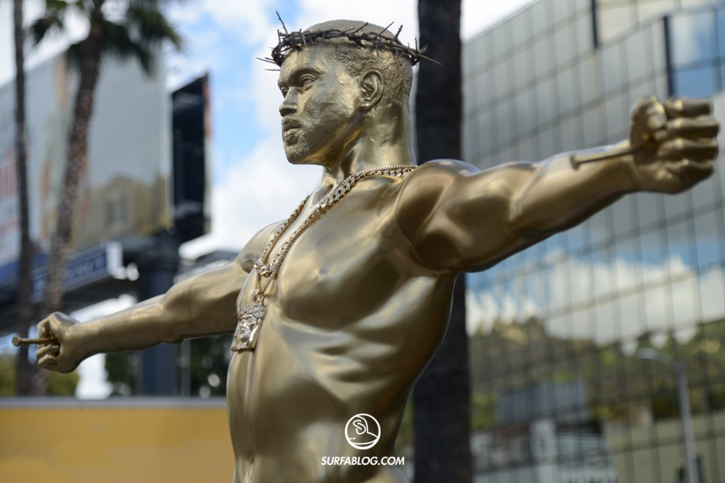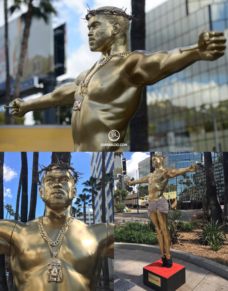 La scultura, installata sulla celebre Hollywood Boulevard, è stata realizzata dall’artista Plastic Jesus, che ha dichiarato: