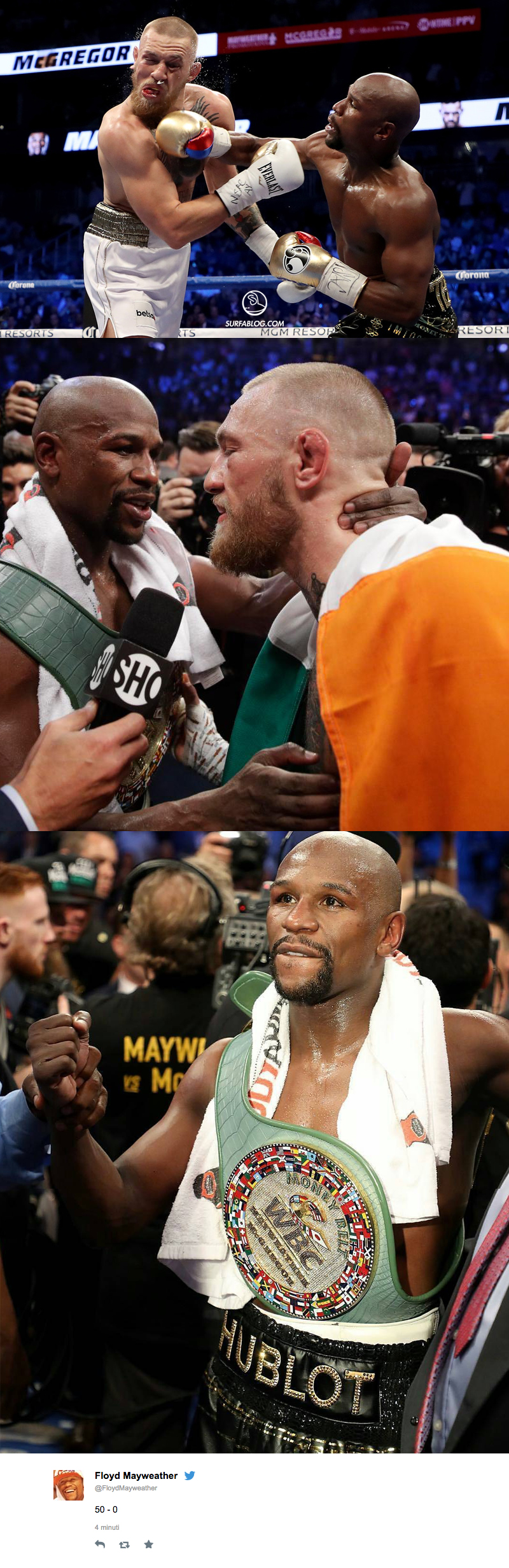Il successo per il pugile è arrivato al decimo round per ko tecnico, arrivando così al suo cinquantesimo successo in carriera, restando imbattuto e superando il primato di Rocky Marciano. Nelle prime riprese Floyd ha fatto sfogare Conor, ma poi dal quinto round ha cambiato marcia, piazzando dei colpi micidiali che hanno costretto l’arbitro ad interrompere il match. Alla fine dell’incontro i due sfidanti si sono abbracciati e McGregor si è congratulato con il rivale. Questo trionfo è valso a Mayweather 300 milioni di $. Sugli spalti della T-Mobile Arena erano presenti numerosi personaggi tra cui: Diddy, Lebron James, J Lo, Mike Tyson, Isaiah Thomas, Demi Lovato, Charlize Theron, Nas e molti altri.