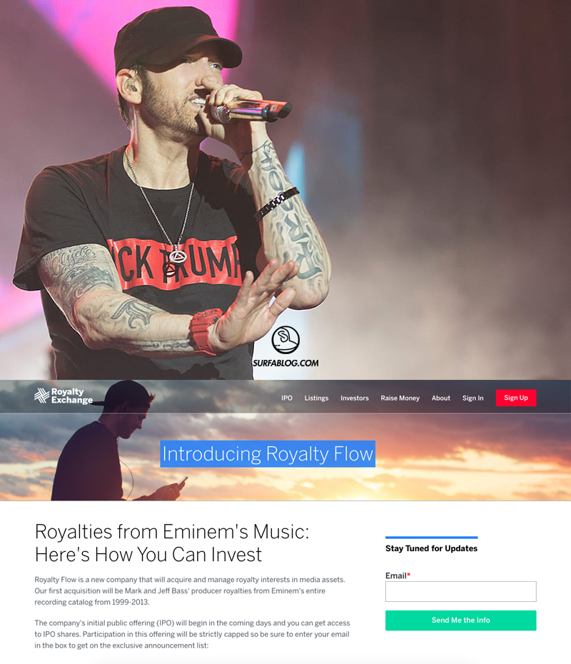 Con più di 172 milioni di dischi venduti, Slim Shady è l’artista maschile di maggior successo del music business negli ultimi 25 anni. La società sopracitata ha deciso di investire su Marshall Mathers, comprando il 25% del catalogo dell’MC di Detroit che, dopo un’offerta pubblica iniziale per raccogliere tra gli 11 ed i 25 milioni di $, sarà quotato in borsa. Royalty Flow ha rilasciato il seguente comunicato: