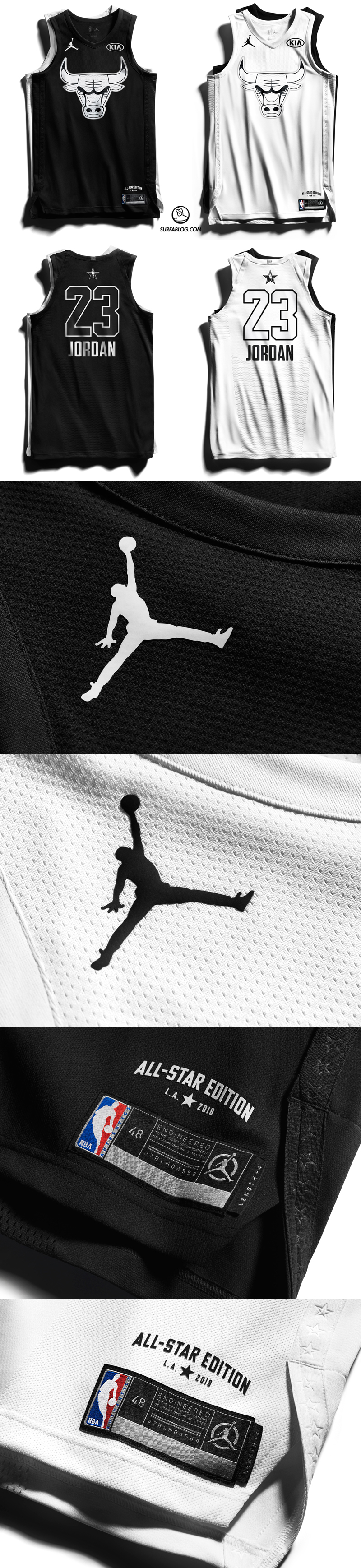 Per questa edizione ci sono due novità assolute: per la prima volta nella storia della lega, il giocatore più votato ad Est (LeBron James) e quello più votato ad Ovest (Stephen Curry), hanno scelto i propri compagni di squadra. Inoltre è anche la prima edizione che vedrà il logo Jumpman sulle divise. I colori utilizzati sono il bianco ed il nero alternati ed il font usato è quello ispirato al logo di Los Angeles. Nel fronte della maglia, c’è lo stemma (sempre in bianco e nero), della squadra di appartenenza del giocatore.