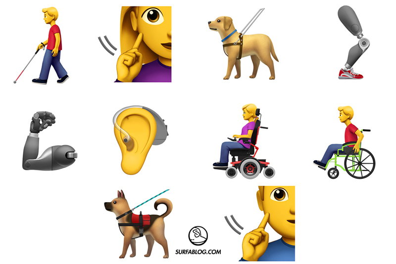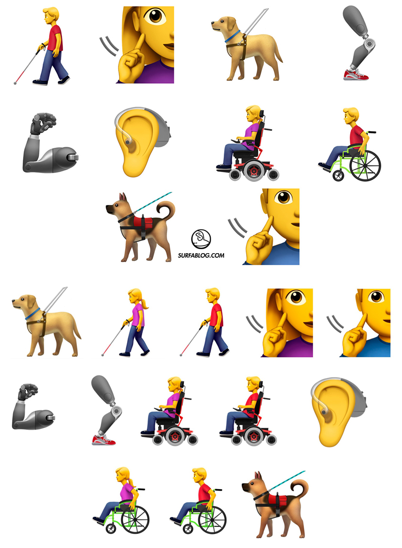 Le emoji a tema saranno 13: dalle protesi per gli arti, agli apparecchi acustici, dai cani guida al linguaggio dei segni, dalle sedie a rotelle ai bastoni per non vedenti. La richiesta è stata fatta al consorzio Unicode (l’ente responsabile di definire i set di caratteri in uso presso i dispositivi elettronici) e l’approvazione richiederà qualche mese.