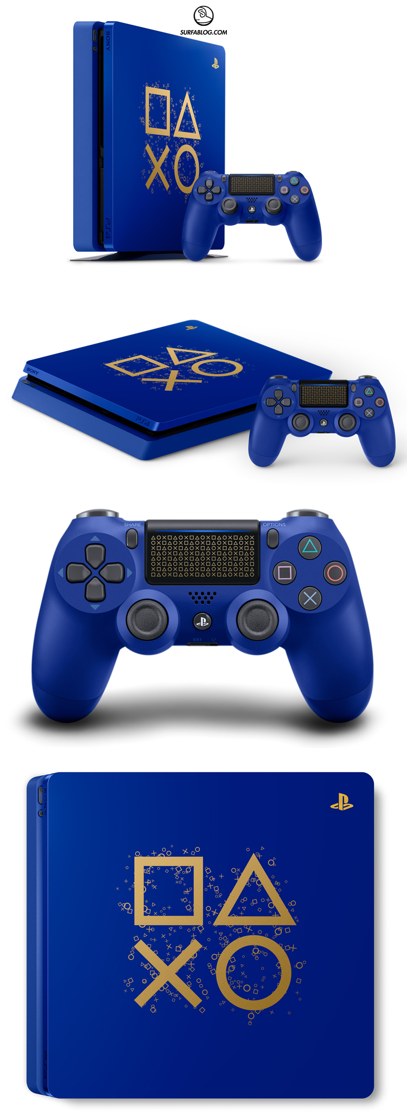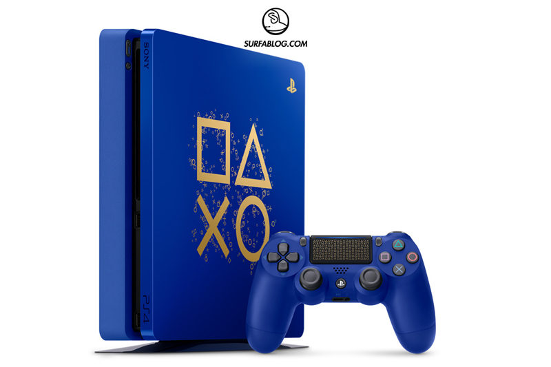 PS4 è di colore blu e presenta le rifiniture in oro.