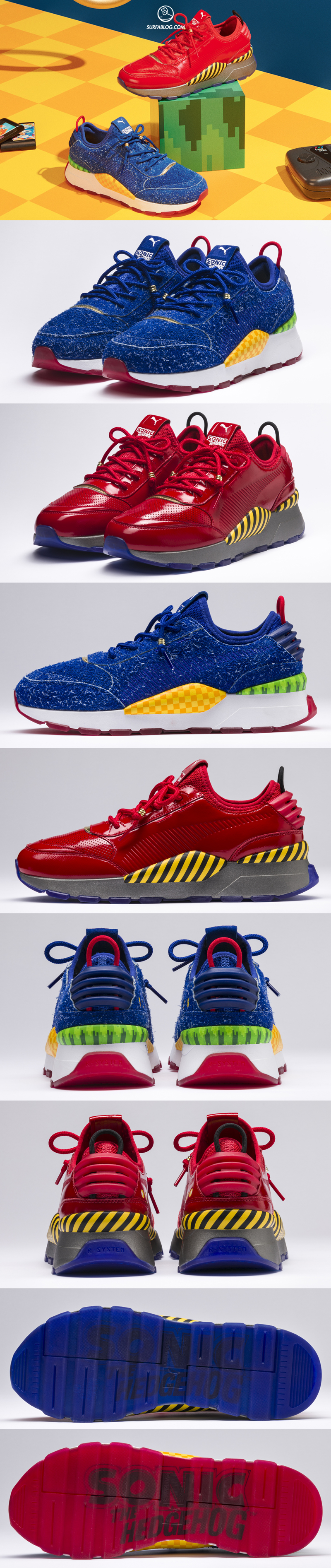 Il modello “Sonic” prende spunto da Sonic the Hedgehog e dai luoghi cult del videogame, inclusa l’iconica zona di Green Hill. La tomaia blu ruvida, si ispira alla pelliccia del personaggio, il rosso della suola, richiama le sue scarpa, il giallo ricorda gli anelli d’oro ed il verde riprende quello del prato.
