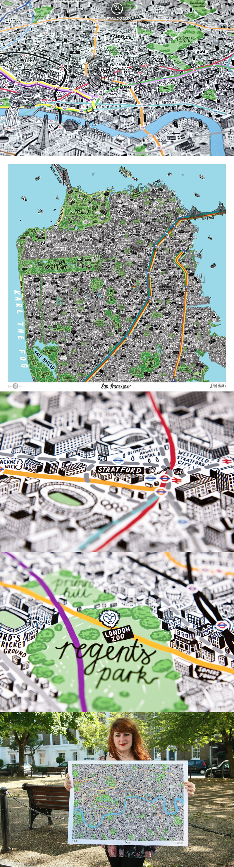 Lo stile giocoso e colorato, ricrea le strutture di alcune delle maggiori metropoli al mondo. Da Londra a New York City, ogni mappa mostra la cultura e la personalità di ogni luogo, attraverso disegni bizzarri, dettagli divertenti e attrazioni locali. La prima opera della Sparks risale al 2012 ed è stata la mappa di Londra, che poi è stata utilizzata come mappa turistica e come parte del pavimento dell’aeroporto di Gatwick.