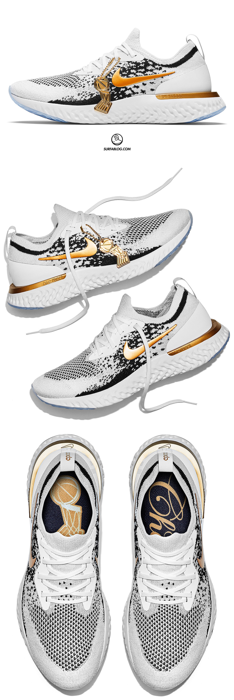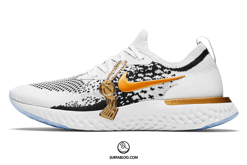 Per celebrare la seconda vittoria consecutiva dei Golden State Warriors in NBA, Nike ha realizzato una Epic React Flyknit chiamata “Champions” che mostra i colori del Larry O’Brien Trophy. La scarpa sarà prodotta in soli 37 esemplari e sarà disponibile in un range di size che va dalla taglia 9 alla 18.