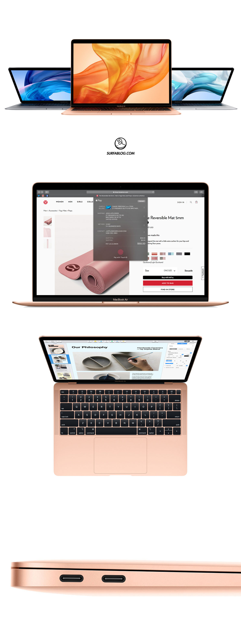 Si tratta dell’esemplare più sottile in alluminio che Steve Jobs tirò fuori da una busta nel 2008. Il nuovo modello è realizzato in alluminio riciclato ed è un mix tra MacBook Pro e MacBook. Dal primo eredita il trackpad, il display retina da 13,3’’, il sistema audio stereo e il processore T2. Dal secondo invece riprende le forme e la scocca, che è disponibile in 3 colorazioni: gray, gold e silver.