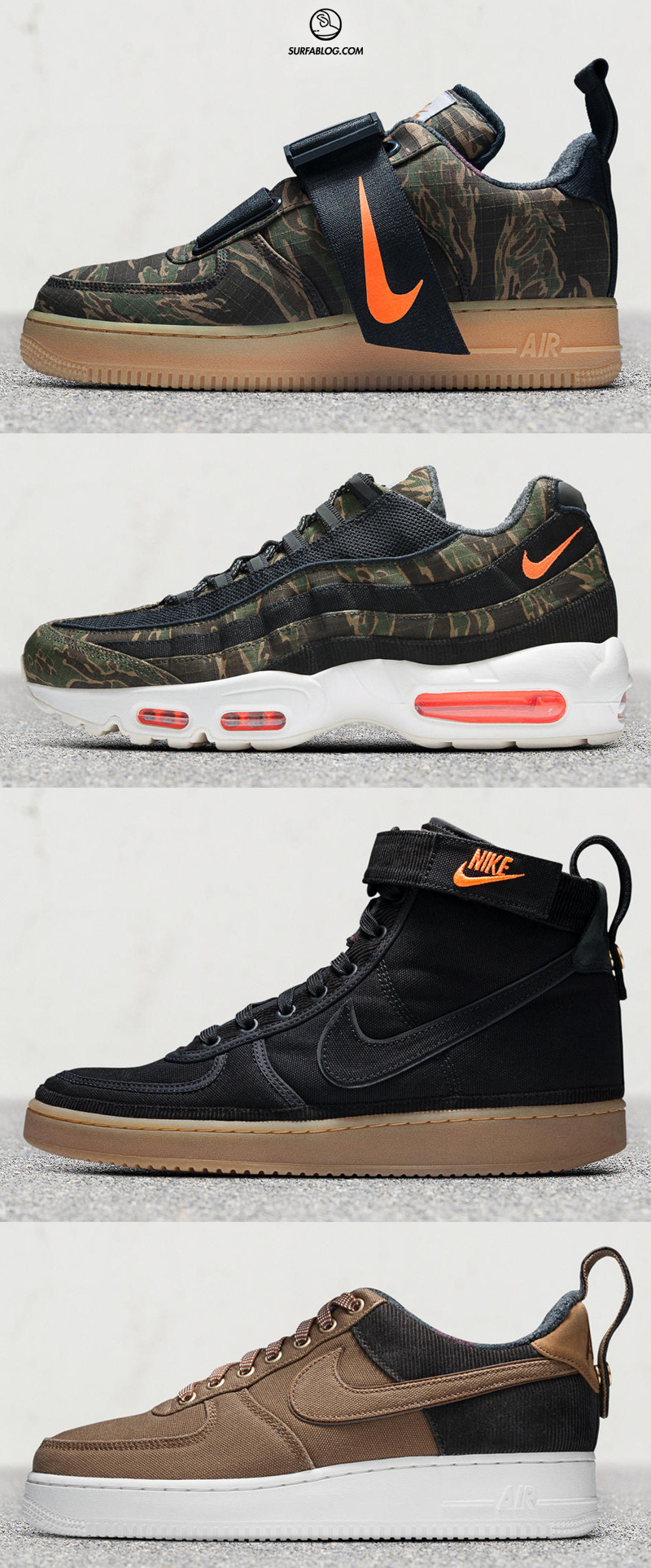 Fondata nel 1989, Carhartt Work In Progress (WIP) ha ridefinito l’animo marcato e grezzo del workwear originale di Carhartt e lo ha adattato ad un nuovo pubblico, che apprezza capi resistenti con un design contemporaneo. In questa collezione, i materiali principali di Carhartt WIP come Dearborn Canvas in Hamilton Brown e nero e Camo Tiger Ripstop, caratterizzano le 4 sneakers Nike: la Air Force 1 Low, Vandal Supreme High, Air Force 1 Low Utility e Air Max 95.