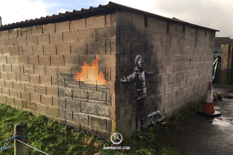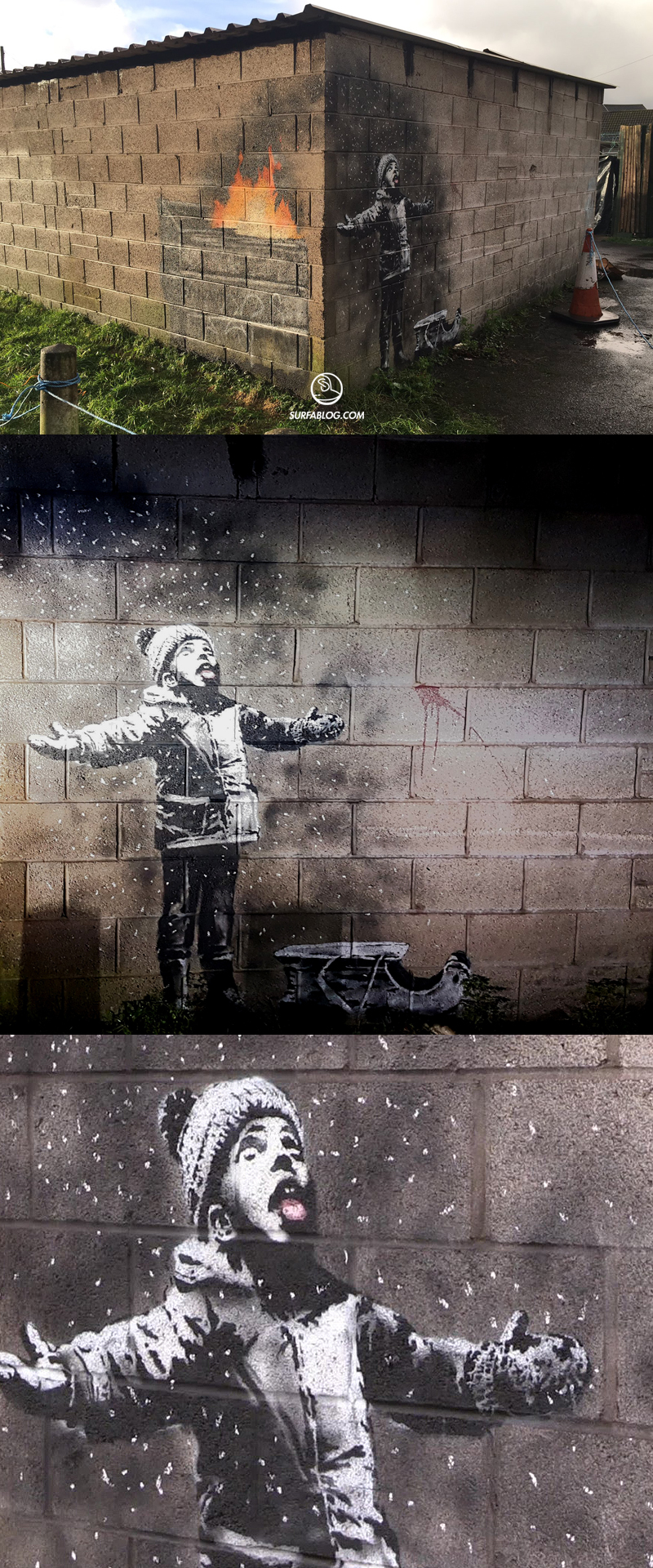 Banksy ha realizzato una nuova opera. Stavolta il tema è il Natale e viene raffigurato un bambino, che apparentemente felice, gioca con la neve a braccia aperte, bocca spalancata e lingua di fuori.
