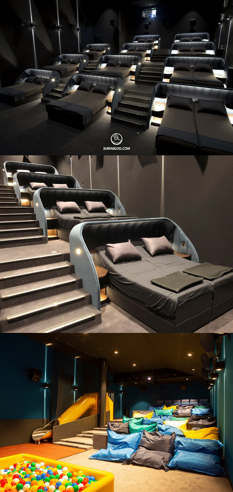 Al posto delle poltrone, in alcune sale sono presenti dei letti matrimoniali. Le lenzuola vengono cambiate ad ogni spettacolo ed il costo per un film è di 43 € a letto. C’è anche uno spazio per i bambini, in cui possono godersi lo show, su uno scivolo o su dei cuscini giganti.