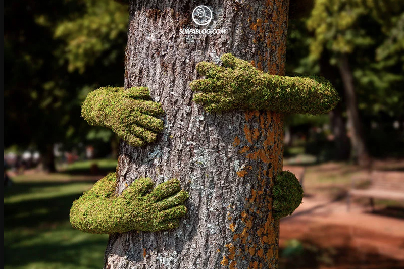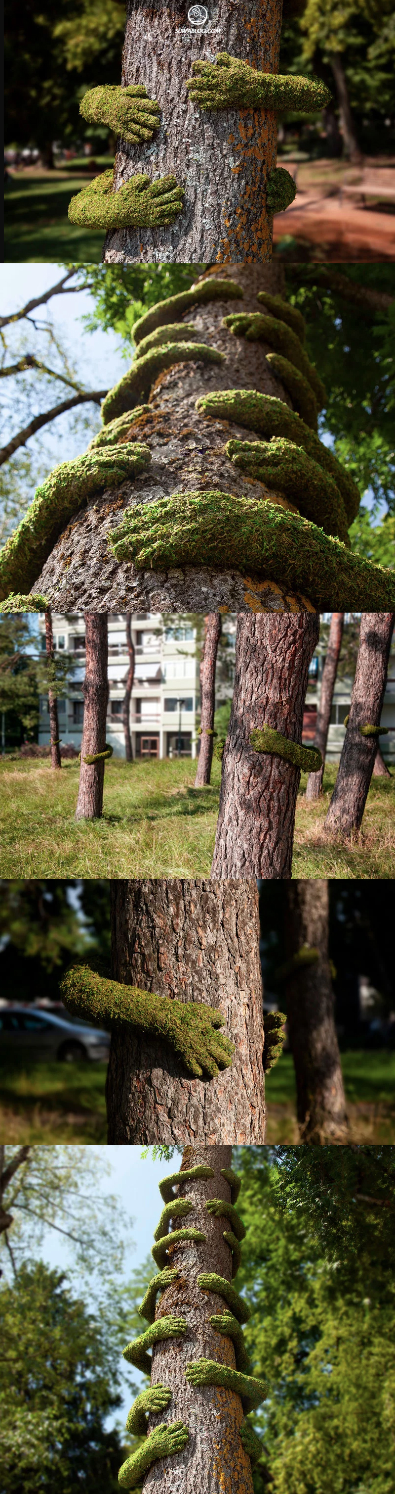 L’artista ha installato delle braccia di muschio, sui tronchi degli alberi situati nei giardini di Annecy, in Francia.