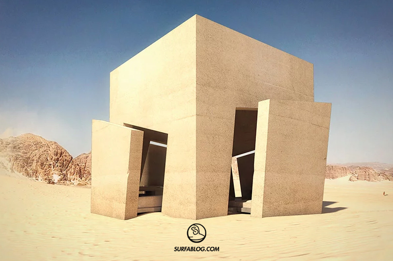 La casa, dalla struttura cubica, si trova dispersa nella sabbia e presenta dei tagli sulle