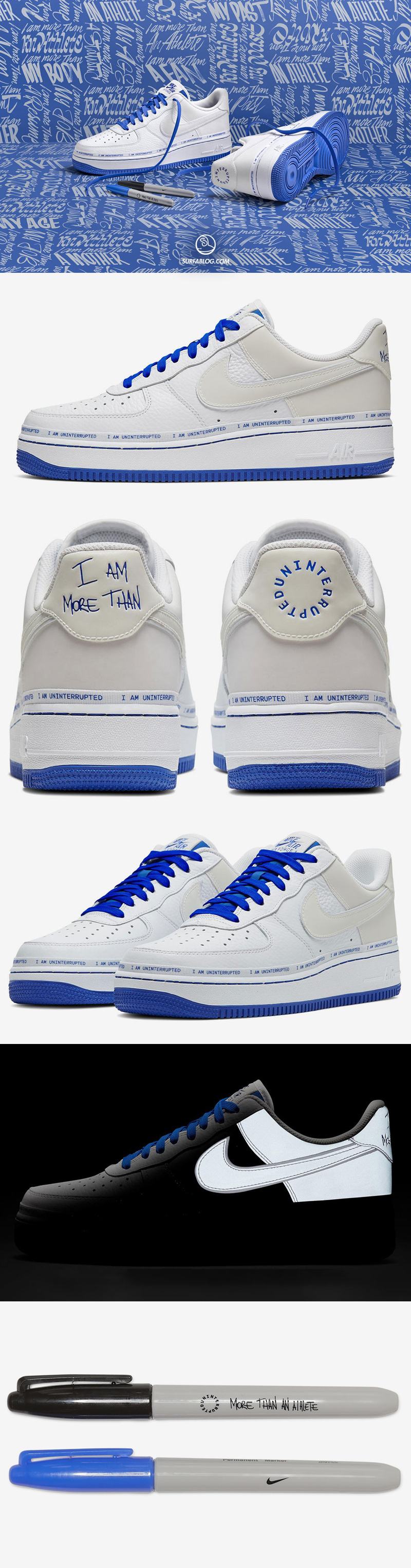 La scarpa ha la tomaia bianca con la scritta “I AM UNINTERRUPRED” sulla intersuola e dettagli in blu elettrico. La sneaker viene venduta con due pennarelli, uno nero e uno blu, per scrivere sulla tomaia la propria storia.