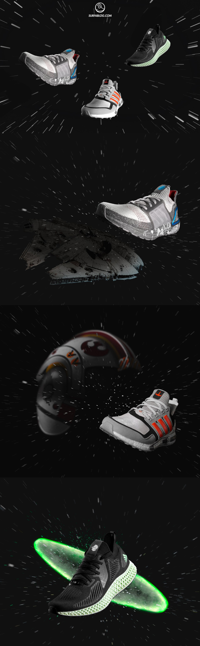 La “X-Wing Starfighter”, la Millennium Falcon” e la “Death Star”riprodotte in versione UltraBOOST S&L, UltraBOOST 19 e Alphaedge 4D. I prezzi vanno dai 180 ai 300 $.