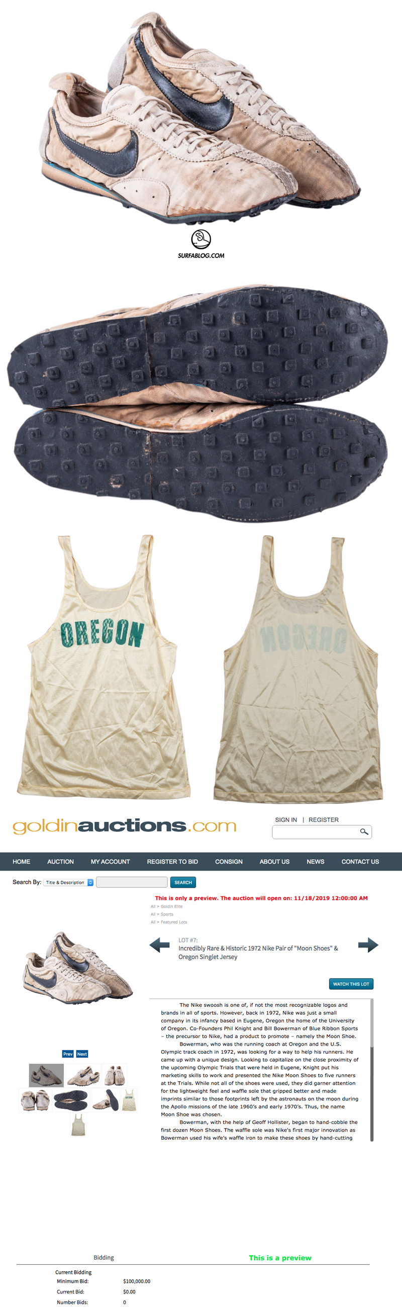 Il modello è stato creato dal co-fondatore di Nike, Bill Bowerman e presenta la suola Waffle. Siccome quando veniva indossata, la scarpa lasciava un’impronta simile a quella degli astronauti della missione Apollo, è stata chiamata “Moon Shoe”. Solo una piccola quantità del modello originale è ancora esistente e un paio di queste verrà messo in vendita da Goldin Auctions. All’inizio del 2019, una delle paia originali è stata venduta per 437.500 $, diventando così la sneaker più costosa della storia (per saperne di più clicca qui e clicca qui).