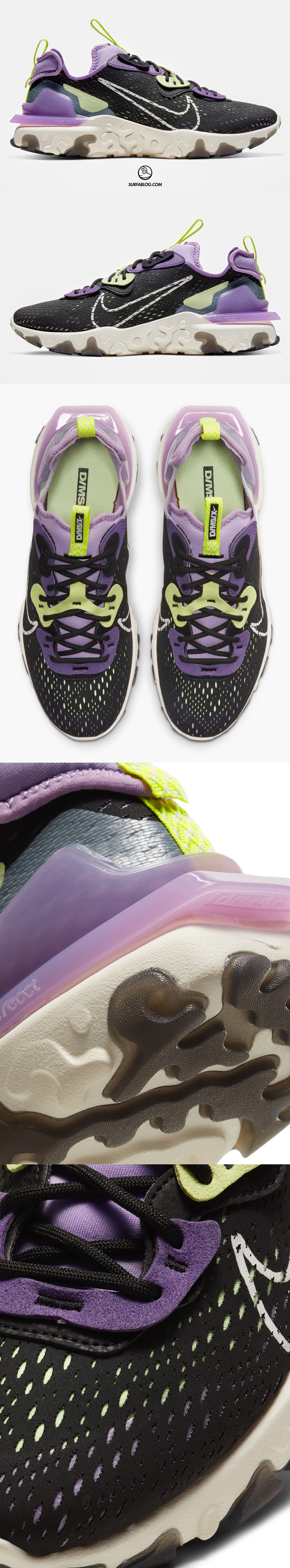 Nike Sportswear continua a sperimentare con Nike React per trovare nuove soluzione di ammortizzazione da indossare tutto il giorno. Nike React Vision, utilizzando dettagli già sperimentati nella serie Element, garantisce ulteriore comfort anche grazie a leggeri rimbalzi che accompagnano ogni passo.