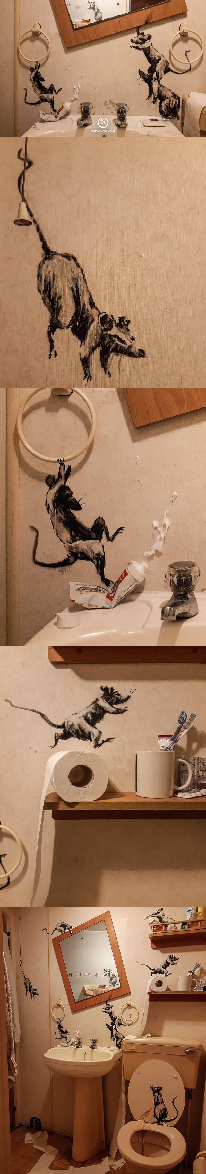 Su Instagram ha pubblicato la sua ultima opera: un gruppo di ratti che stravolgono il bagno della sua casa. Il commento della foto è “Mia moglie odia quando lavoro a casa”.
