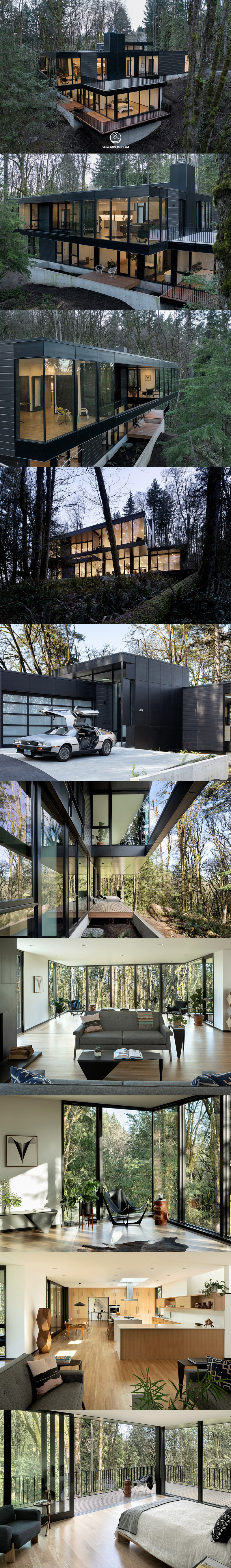 La casa, immersa nella foresta, si estende su due piani, caratterizzati da grandi vetrate.