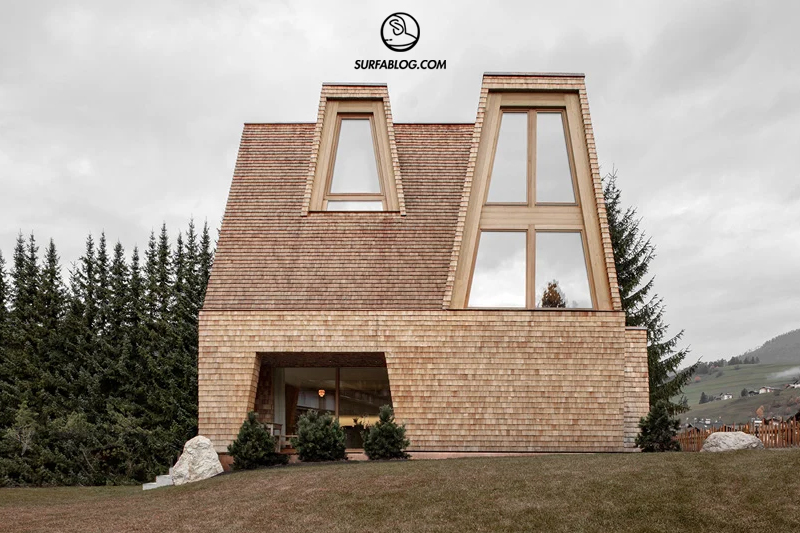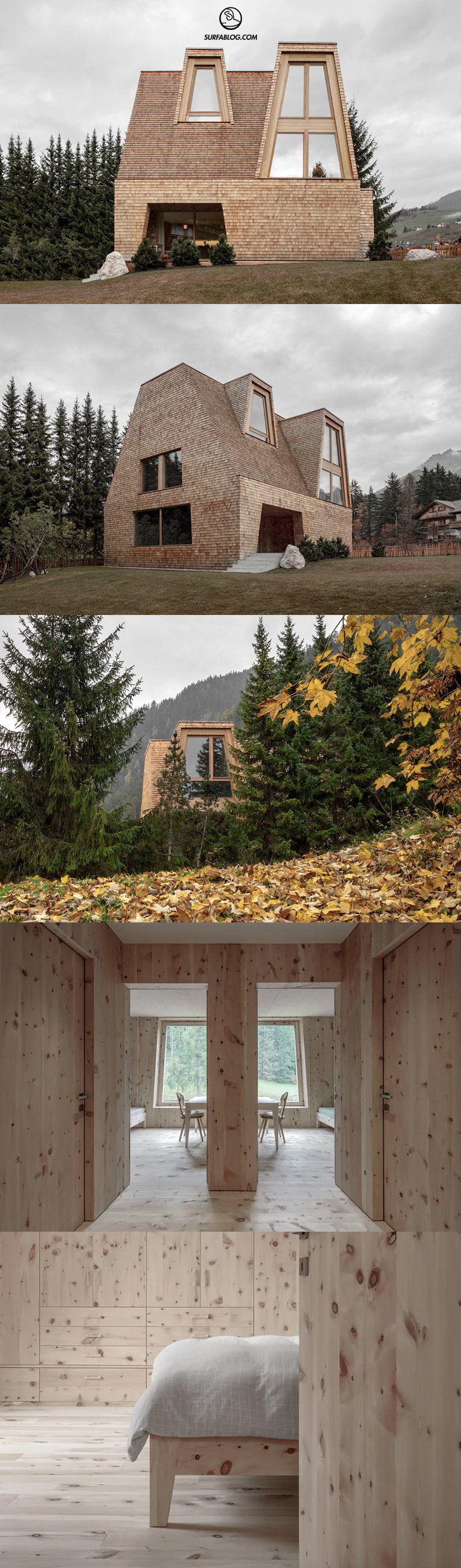 La casa si trova nella Val Badia sulle Dolomiti ed è interamente realizzata in legno. La struttura non fa distinzione tra tetto e facciata e l’abitazione si estende su 3 piani.