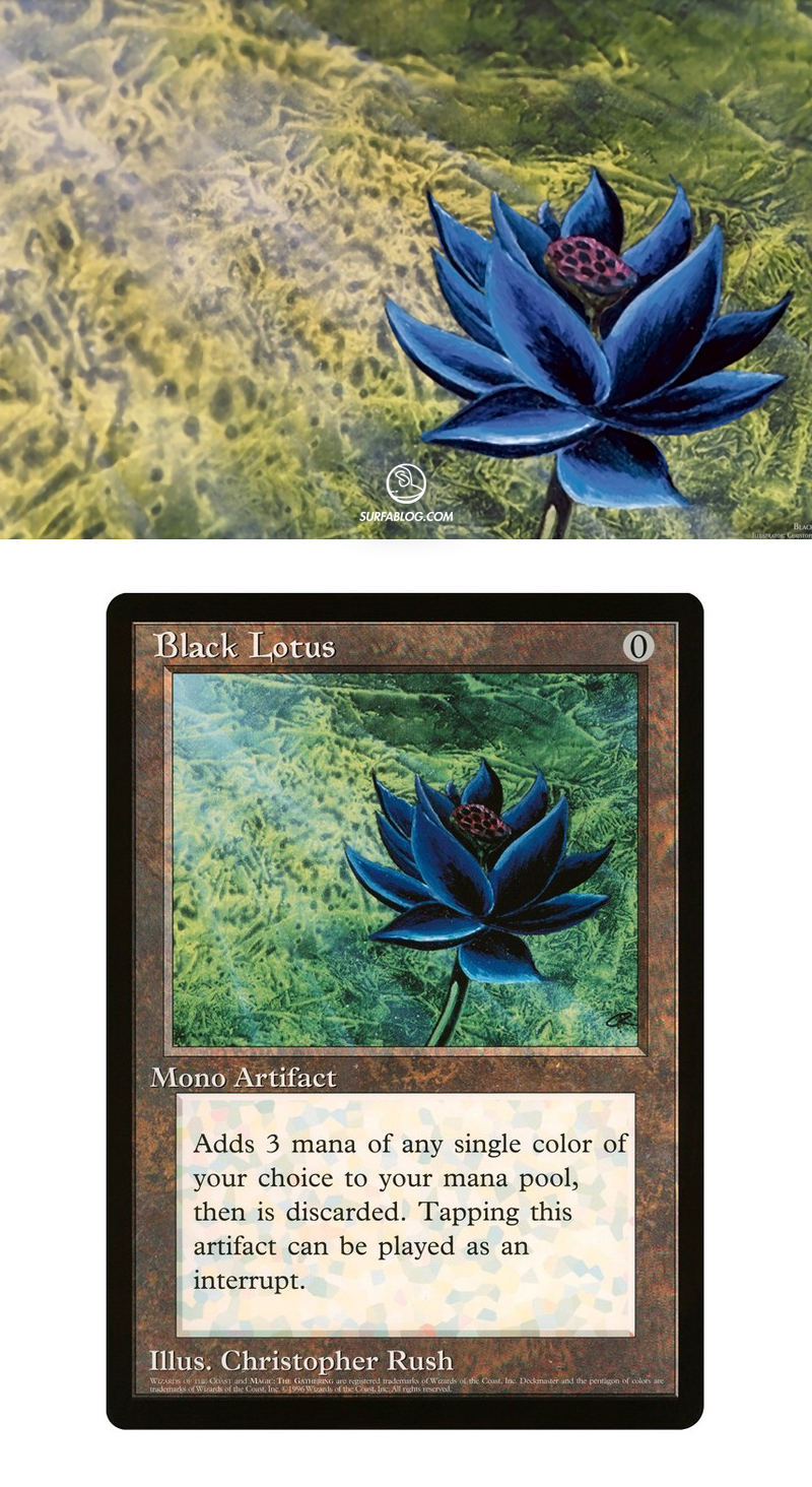 Il Black Lotus è considerato la carta di maggior valore del gioco e nel mercato dei collezionisti è divenuta la più rara e costosa tra le carte delle edizioni base. L’illustrazione è stata disegnata da Cristopher Rush, a quei tempi dipendente della Wizards of the Coast e rappresenta un fiore di loto di colore nero con un denso fogliame sullo sfondo.