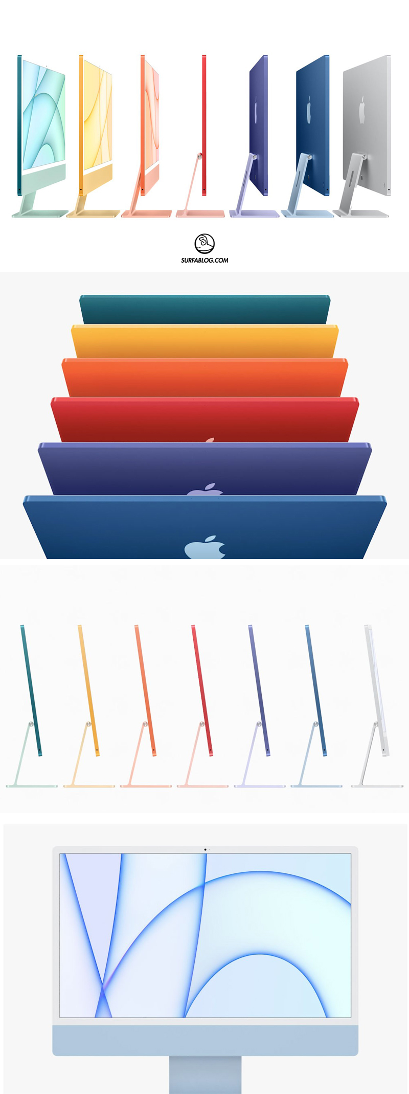L’iMac dice così addio ad Intel e sarà disponibile in 7 colori: blu, verde, rosa, argento, giallo, arancione e viola, ricordando così i vecchi iMac G3.