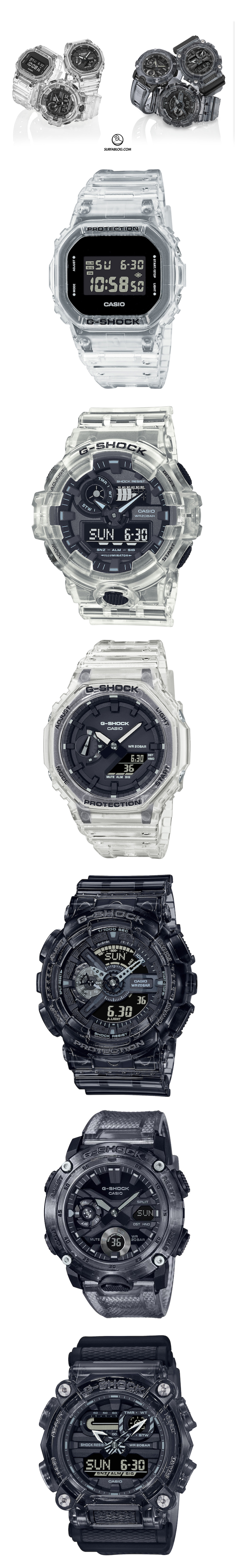 La capsule è composta da 6 modelli dal look futuristico minimalista, caratterizzati da cinturino e lunetta completamente trasparenti. Gli orologi, disponibili nelle versioni black e white sono: il GA-900SKE, il GA-110SKE, il GA-2000SKE, il DW-5600SKE, il GA-700SKE e il GA-2100SKE.