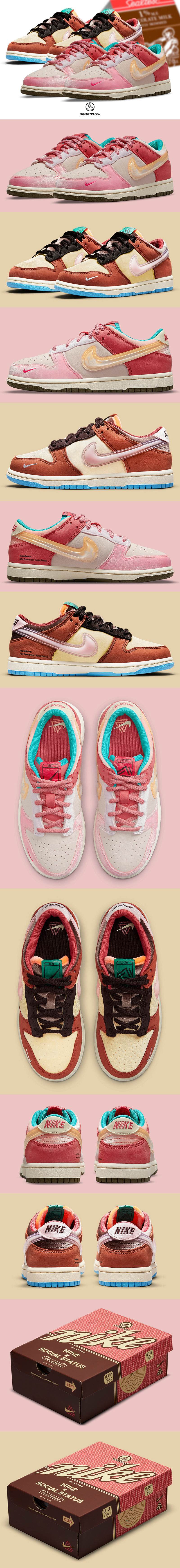 Social Status ha collaborato con Nike per la realizzazione di queste 2 Dunk Low dedicate al cibo, in particolare ai cartoni del latte, alle fragole e al cioccolato.