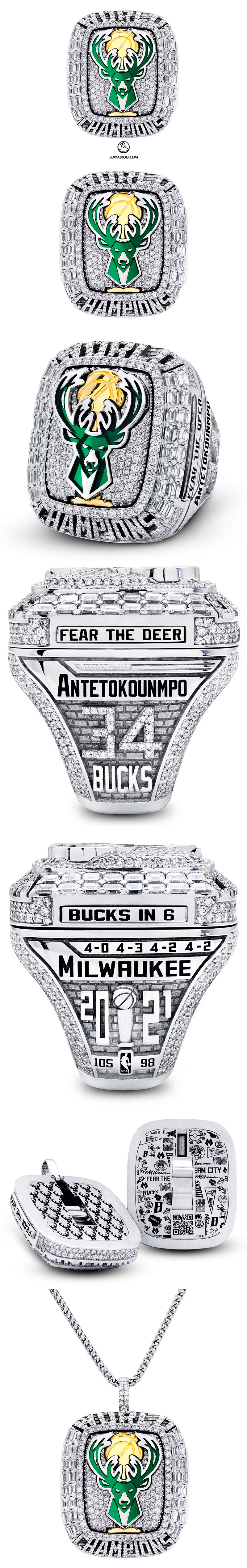 L’anello è composto da 360 diamanti, che rappresentano il totale dell vittorie da quando la proprietà ha acquistato la squadra. 16 sono anche le vittorie nei Playoffs ed i 16 titoli di Division. Il peso dei diamanti in smeraldo è di 4,14 carati e 414 è il prefisso di Milwaukee. All’interno c’è un codice QR che riproduce i video dei momenti salienti della stagione vinte. Inoltre attraverso un tasto l’anello può essere trasformato in un ciondolo. A sinistra c’è il nome del giocatore, il numero e la scritta Bucks, mentre a destra ci sono i risultati delle vittorie dei Playoffs ed ovviamente il Larry O’Brien Trophy con il numero 2021.