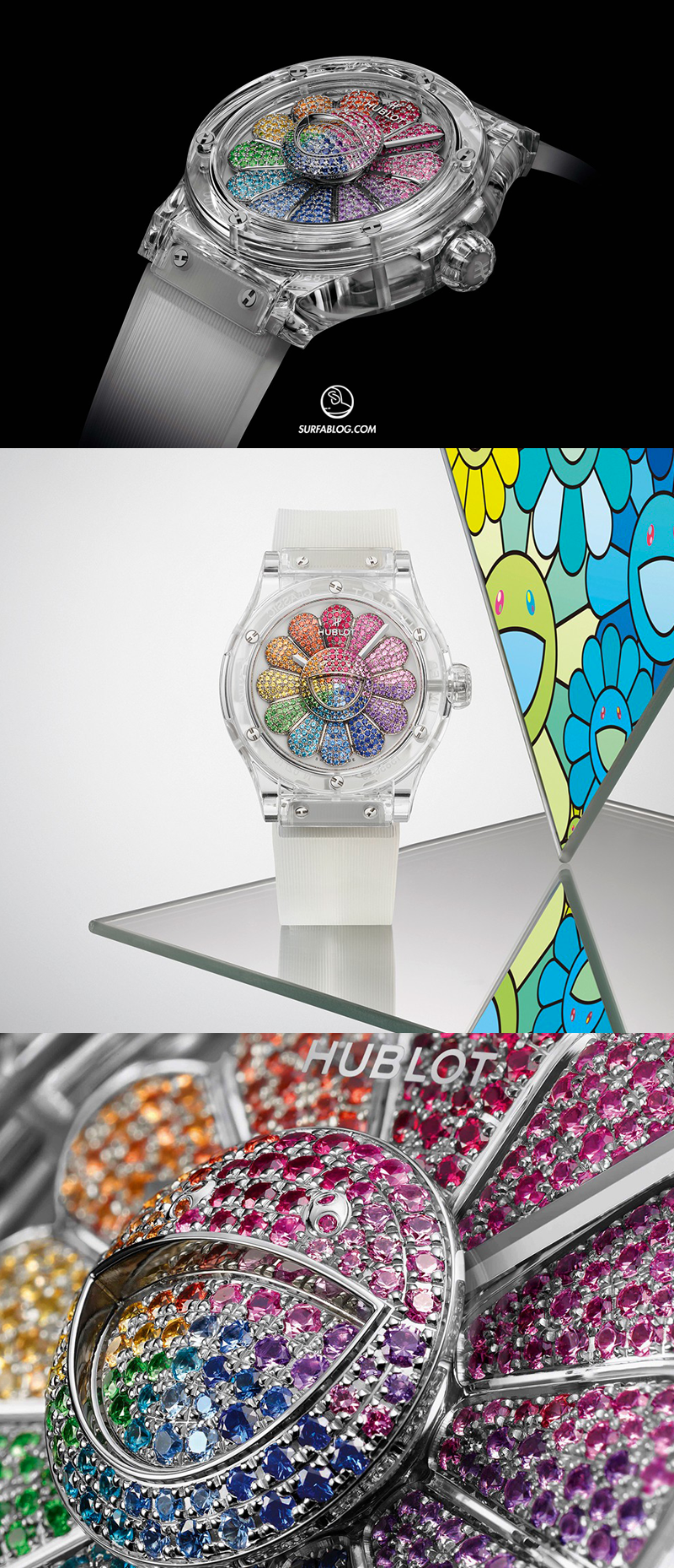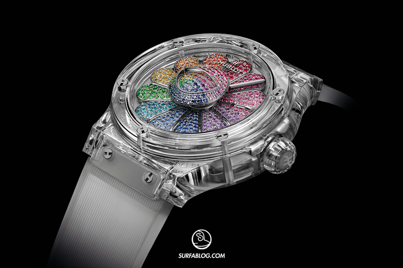 Takashi Murakami ha collaborato con Hublot per questo orologio chiamato Classic Fusion Takashi Murakami Sapphire Rainbow.