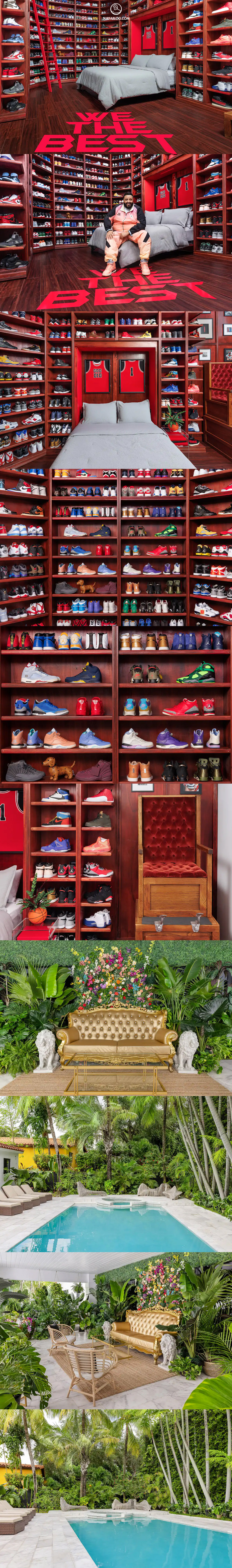 La stanza/armadio è composta da diversi scaffali pieni di sneakers limitate e da un letto a due piazze sotto 2 jersey rosse con la scritta “God Did”. Al di fuori della camera c’è una lounge ed una piscina.