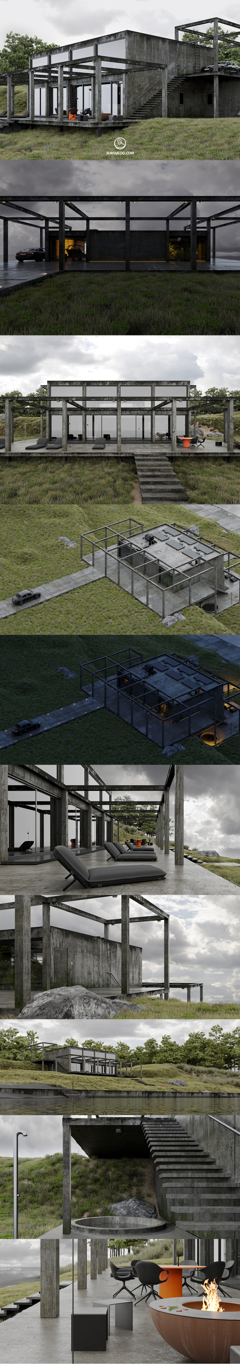 La casa si riconosce subito per il suo concetto strutturale a travi aperte e per la tavolozza dei materiali in cemento grezzo e austero. L’ingresso della villa si trova in cima al tetto.