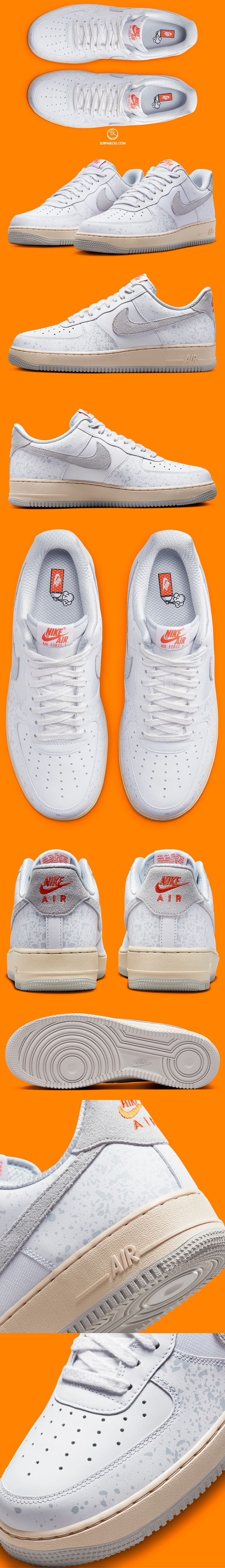 Da questo concetto nasce la AF1 Low “Spray Splatter”, caratterizzata da una tomaia bianca con schizzi di vernice grigia. All’interno sono disegnate 2 bombolette arancioni con il logo Nike.