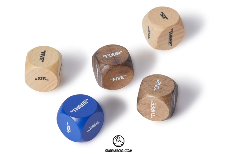 è composto da 5 dati in legno, caratterizzati dai numeri scritti in lettere (ad esempio invece di 6, troviamo “SIX”).