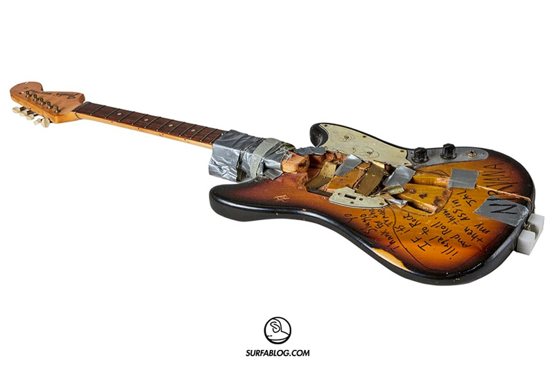 La chitarra elettrica color tabacco è firmata e mezza distrutta. La sua stima iniziale era di 200.000 $, ma dopo 17 offerte è stata battuta per quasi 500.000 $.
