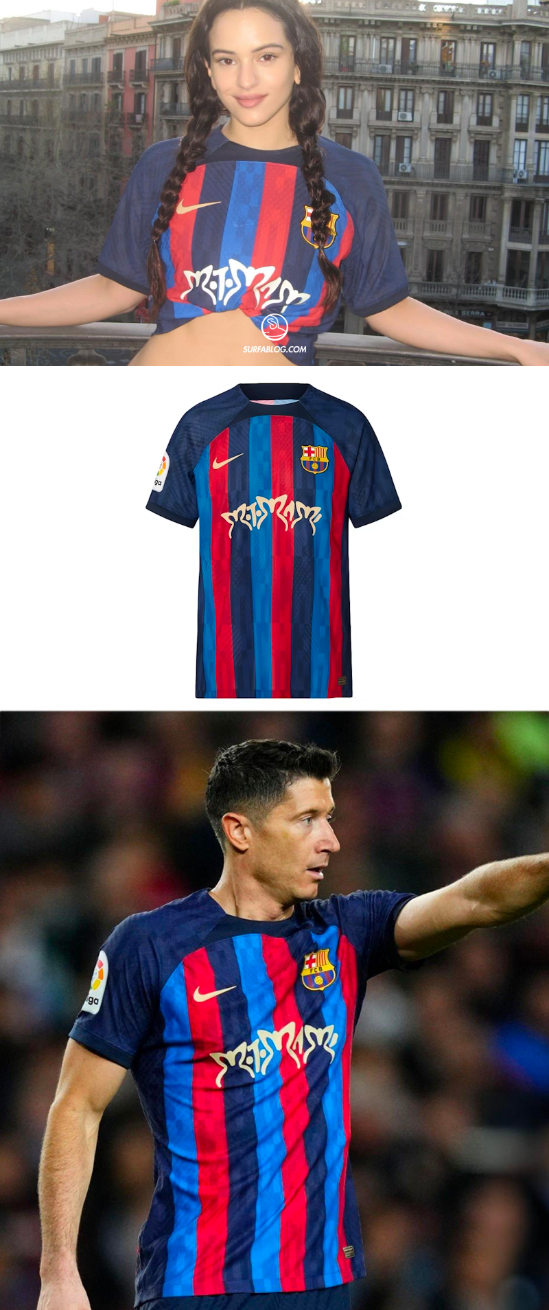 Nel Marzo 2023, il secondo a comparire sulle divise del Barça è stata Rosalia con il logo di “Motomami”, ovvero il titolo del suo disco.