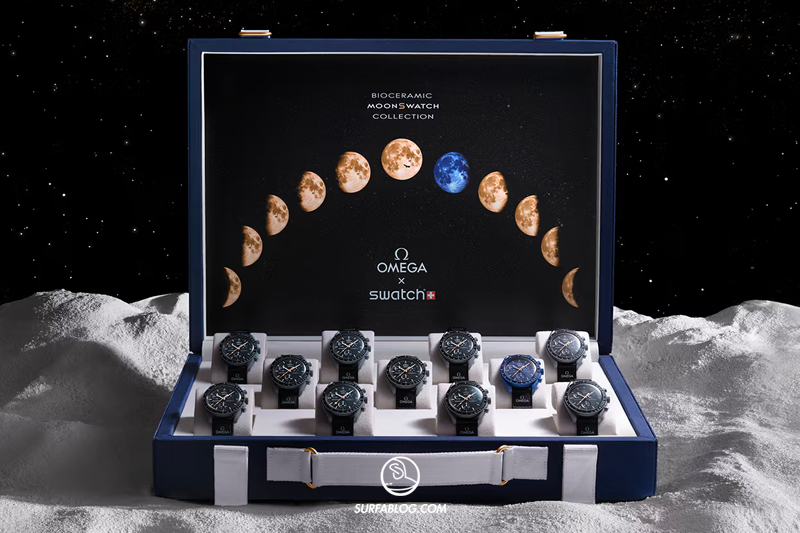 Sotheby’s ha messo all’asta un set inedito di 11 valigie MoonSwatch Moonshine Gold, ognuna contenente 11 orologi Omega x Swatch “Mission to Moonshine Gold”.