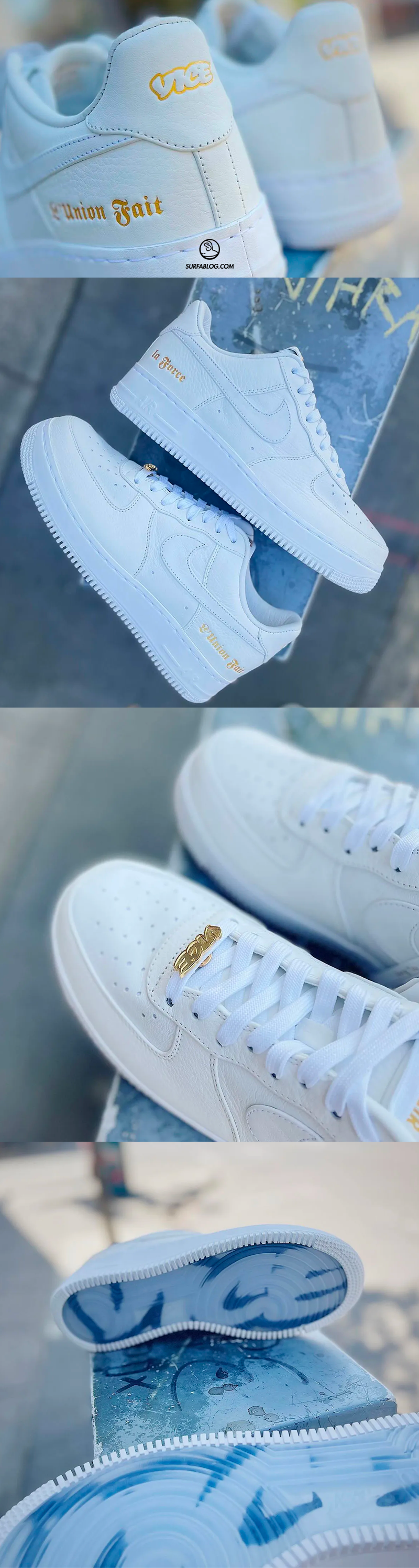 Il modello è in premium leather bianca con dettagli in oro, come le scritte “Vice” e “L’Union Fait La Force”.