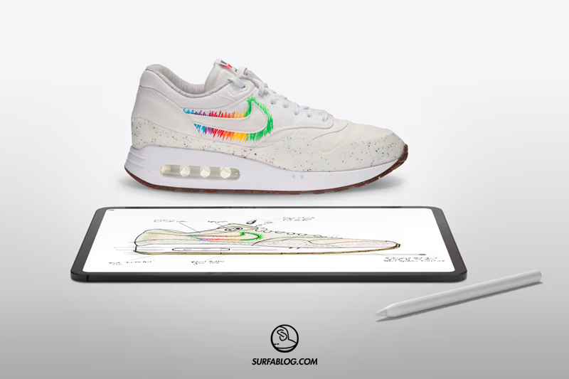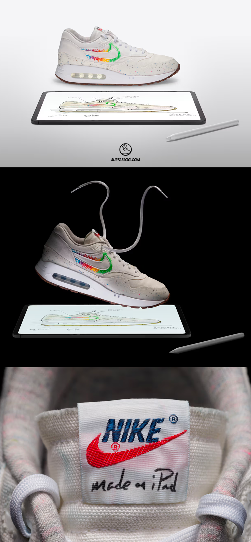 La scarpa presenta una tomaia bianca con degli sketch realizzati con la Apple Pencil Pro. Sulla linguetta c’è infatti la scritta “Made on iPad”.
