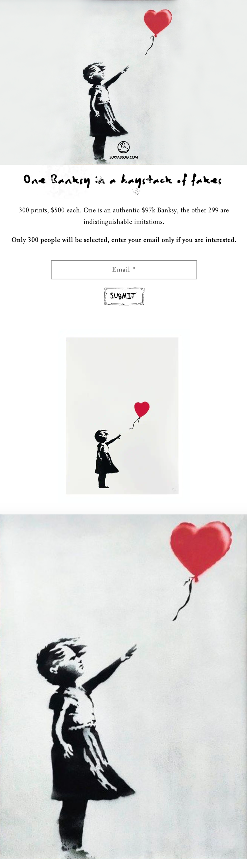 “The Missing Balloon” è il sito realizzato da un collezionista d’arte, in cui viene messo in vendita un Banksy originale da 97.000 $, insieme ad altre 299 repliche dal costo di 500 $.