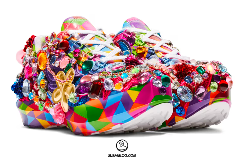 La sneaker presenta la stessa tomaia colorata della SR811, con l’aggiunta di finte pietre preziose.