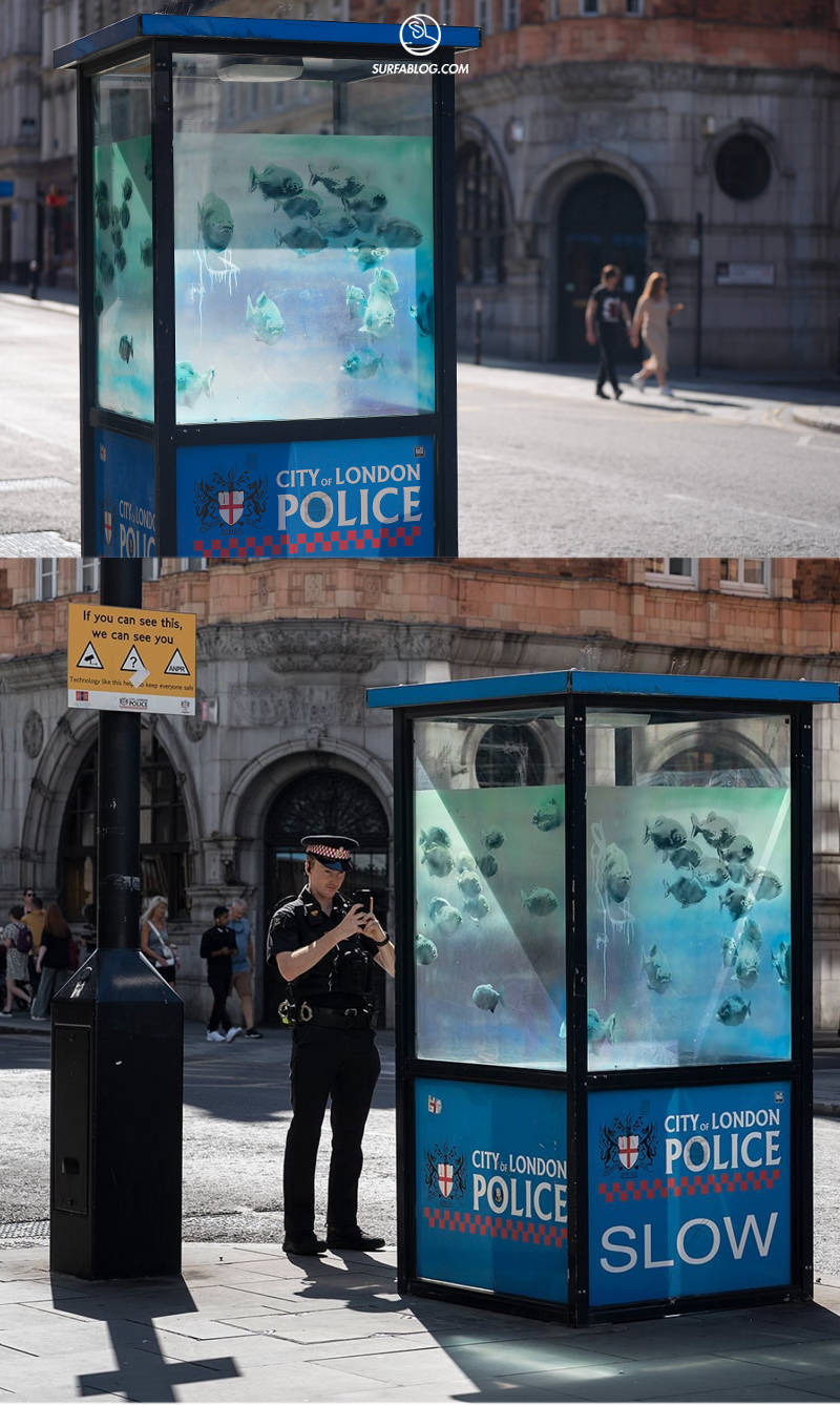 Si tratta di un gruppo di pesci che nuotano in un box office della polizia. L’opera è stata realizzata a Ludgate Hill, Londra. Questa è l’ottava opera di Banksy nel 2024.