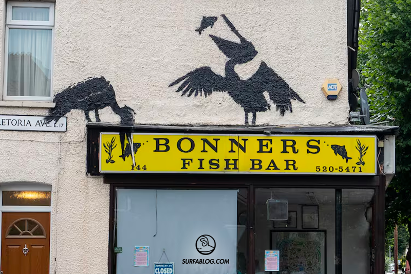 Si tratta di 2 pellicani che si cibano nel Bonners Fish Bar. L’opera è stata realizzata a Northcote Road, Londra. Questa è la sesta opera di Banksy nel 2024.