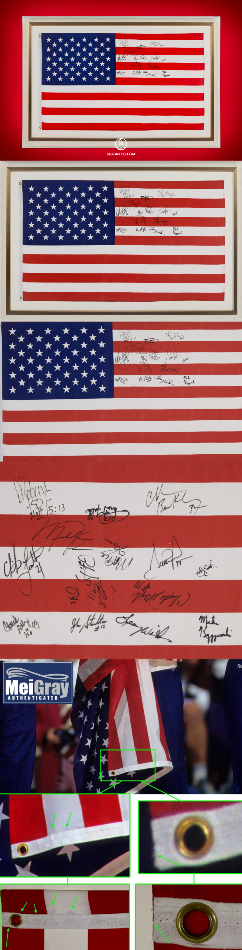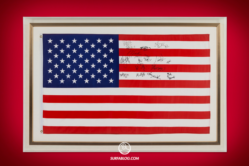 La bandiera era stata usata da MJ per coprire il logo di Reebok mentre riceveva la medaglia d’oro. Il cimelio è stato firmato da: Charles Barkley, Larry Bird, Clyde Drexler, Patrick Ewing, Magic Johnson, Michael Jordan, Christian Laettner, Karl Malone, Chris Mullen, Scottie Pippen, David Robinson e John Stockton.